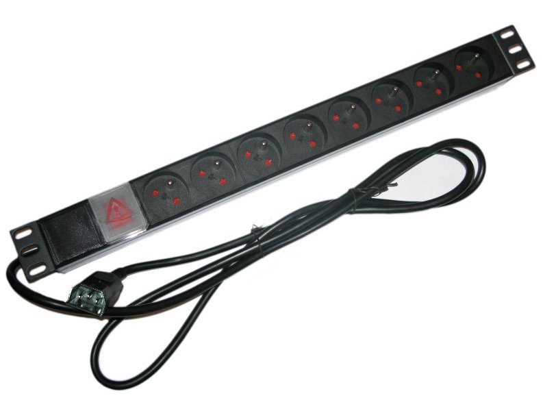 19" rozvodný panel 8x 230 V, zásuvky dle ČSN, vypínač, indikátor napětí, výška 1U, zakončeno přívodním kabelem IEC 320 C14.