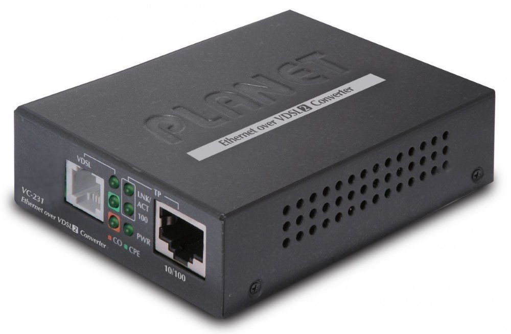 Ethernet po telefonním vedení (technologie VDSL2). 1× LAN RJ-45, 1× VDSL2 RJ-11 konektor. 100/100 Mbps na 300 m. Napájení DC 5 V/ 2 A (zdroj je součástí balení).