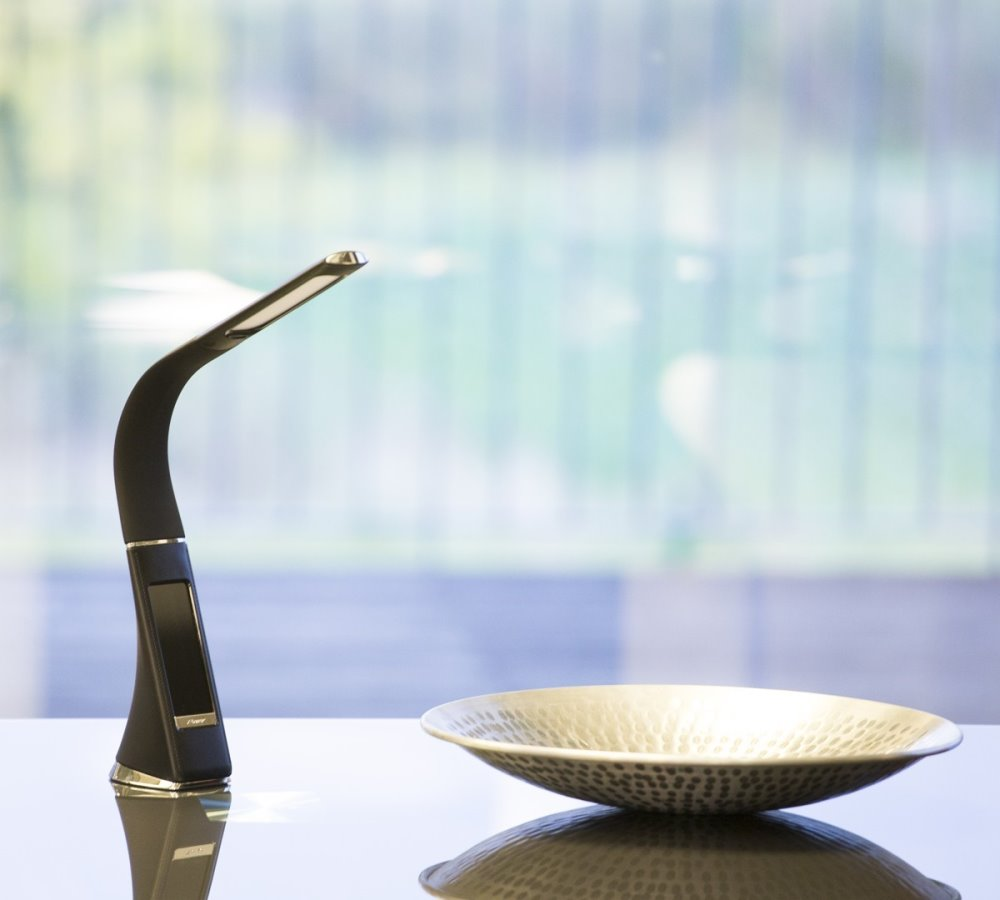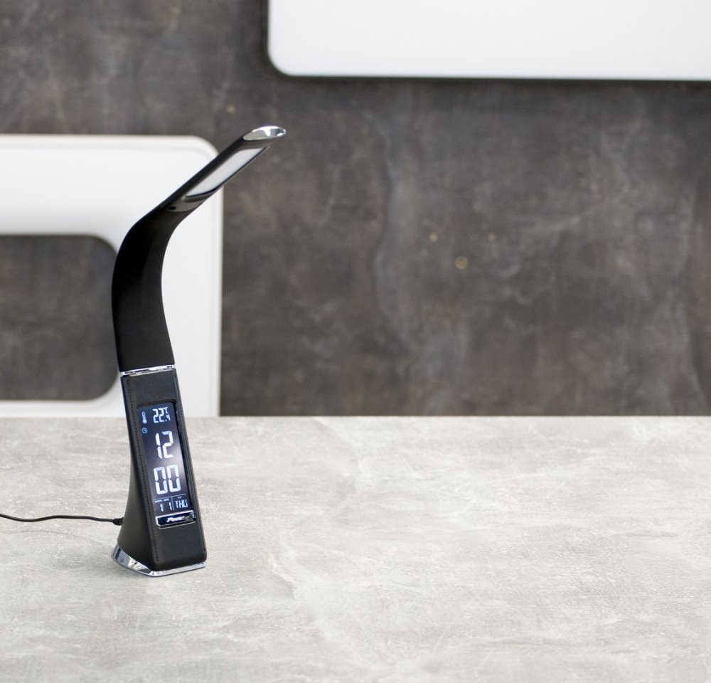 Moderní LED stolní lampička s ohebným ramenem, dotykovým ovládáním jasu a informačním LCD panelem, který zobrazuje údaje o aktuálním času, datu a teplotě. Pokud by vás LCD panel rušil, je možné jej úplně vypnout. Napájení je realizováno skrze přiložený adaptér, nebo přímo z USB portu počítače či powerbanky. Součástí balení je USB kabel o délce 120 cm.