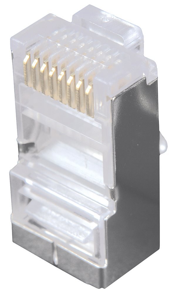 Stíněný neskládaný konektor RJ-45 (8p8c) vhodný pro zakončení strukturované kabeláže. Kontakty jsou kryty 50 µ zlata. Konektor je určený pro kulaté kabely typu drát.