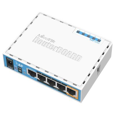 MikroTik hAP je kompaktní síťové zařízení určené pro domácnosti a malé kanceláře, kde potřebujete spolehlivý bezdrátový přístup a několik kabelových připojení. Vychází z osvědčeného modelu RB951-2n a přináší vylepšení v mnoha oblastech. Zařízení je vybaveno dual-chain 2.4 GHz Wi-Fi s podporou standardů 802.11b/g/n a maximální rychlostí 300 Mbit/s.