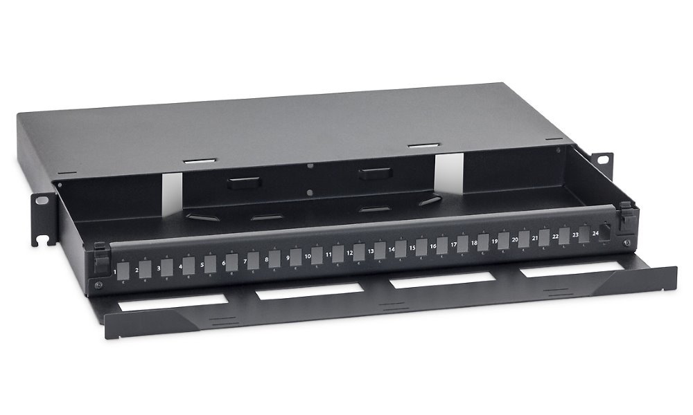 Optická výsuvná vana k ukončení kabelů v datových rozvaděčích s upevněním do 19" rámů.