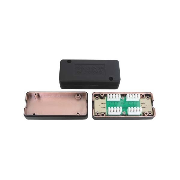 Propojovací box Cat6a, stíněný pokovením. Umožňuje propojit kabelové segmenty beze ztráty kvality vedení. Narážecí kontakty.