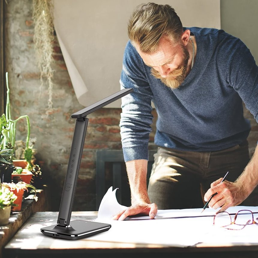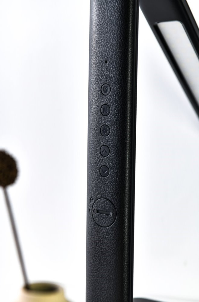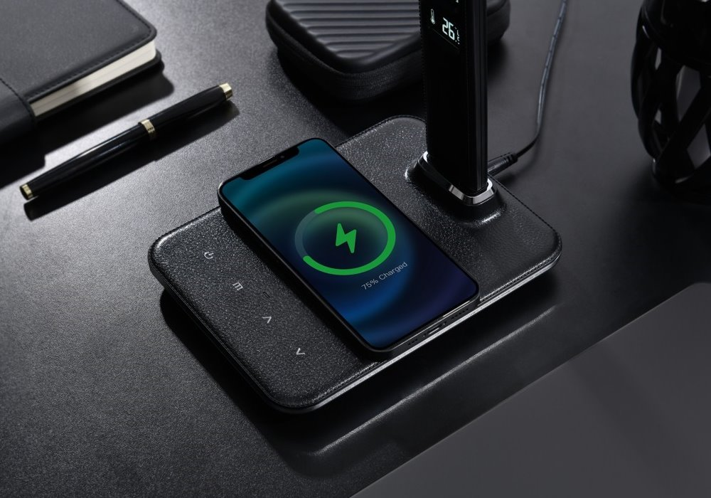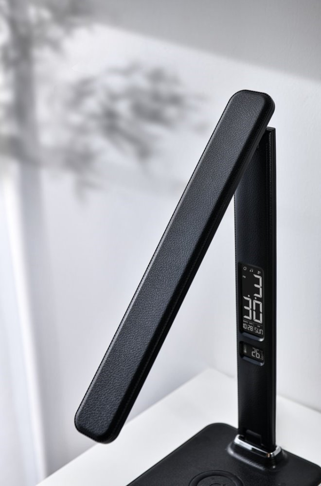 LED stolní lampička s designem imitace černé kůže „s prošíváním“, sklápěcím ramenem a informačním panelem, který zobrazuje údaje o aktuálním času, datu, teplotě a budíku. Nabídne také dotykové ovládání úrovně jasu a barvy světla. Lampička je vybavena bezdrátovou nabíječkou standardu Qi a nabíjecím USB portem. Mobilní telefon s podporou bezdrátového nabíjení se začne nabíjet při pouhém položení na nabíjecí plochu.