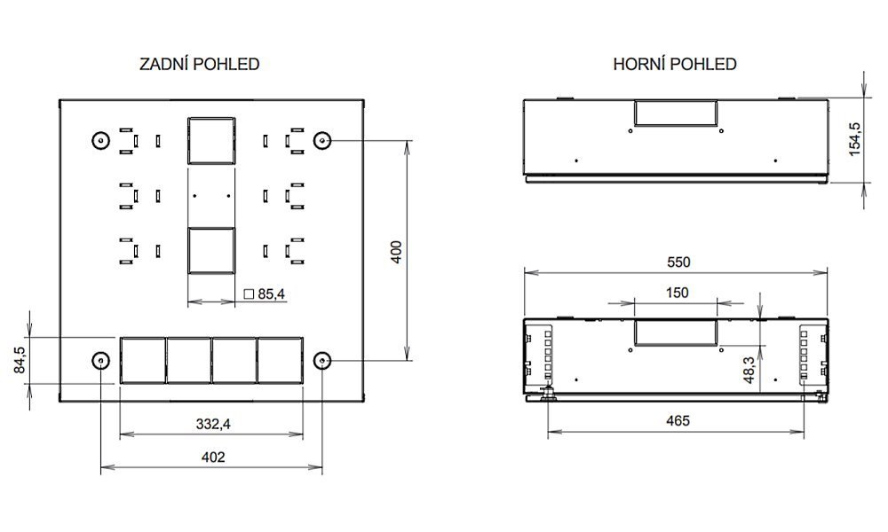 Vstup kabelů je možný předpřipravenými otvory v zádech i ve všech stěnách rozvaděče. V zadní části rozvaděče jsou připraveny otvory pro uchycení na zeď.