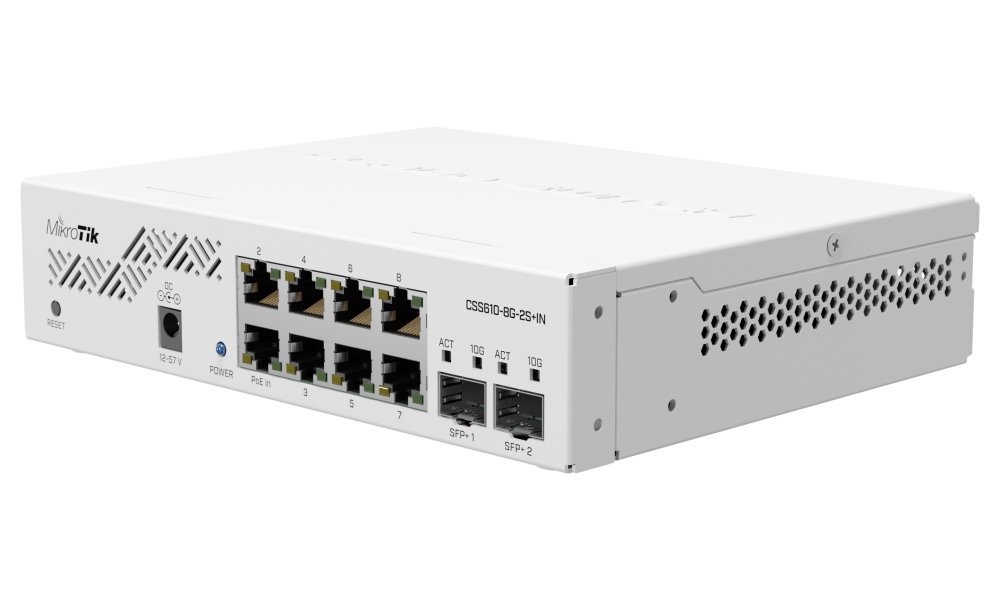 Cloud Smart Switch s osmi GbE porty a dvěma 10G SFP+ sloty. Největší předností je podpora 10Gbps rozhraní a jednoduché rozhraní SwOS.