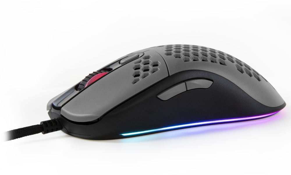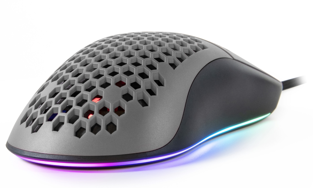 Ultralehká herní myš disponující 7 programovatelnými tlačítky a vysoce přesným optickým senzorem Pixart 3389 s rozlišením až 16000 DPI. Kryt v designu plástve snižuje celkovou hmotnost, zlepšuje odvod tepla, a tím zajistí i pevnější uchopení myši. Herní design poté doplňuje nastavitelné RGB podsvícení. Kvalitní spínače Omron vydrží více než 20 milionů kliknutí. Připojení je realizováno skrze opletený USB kabel.