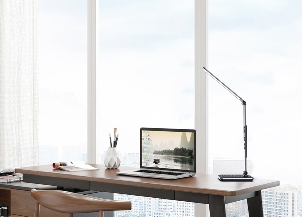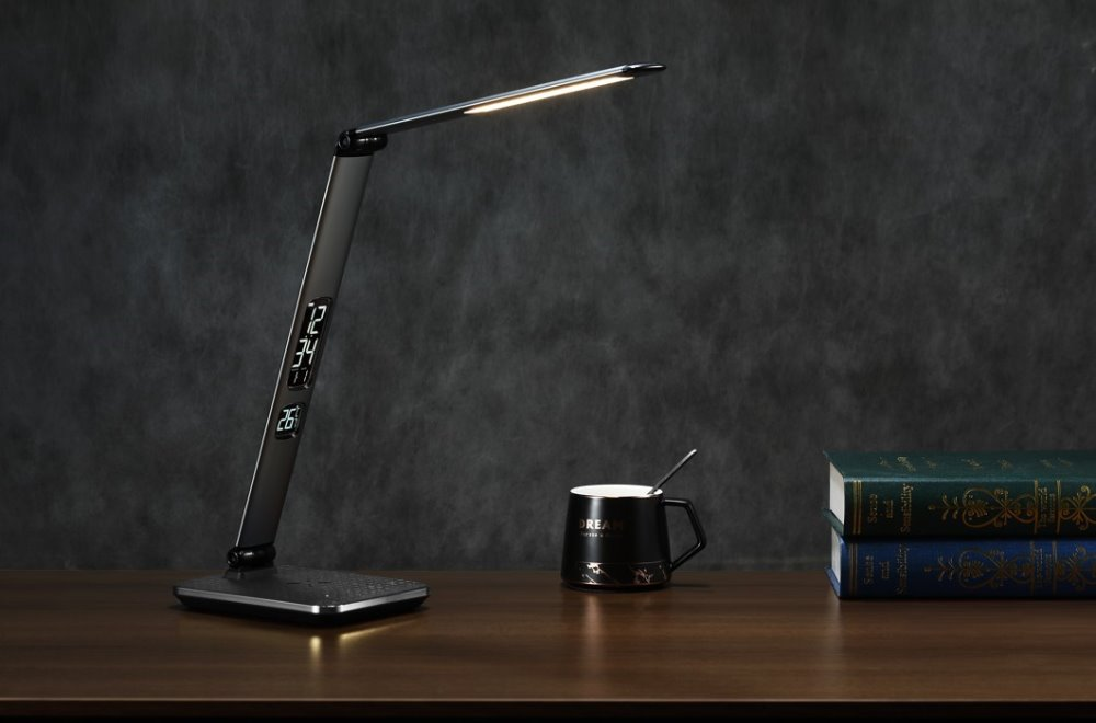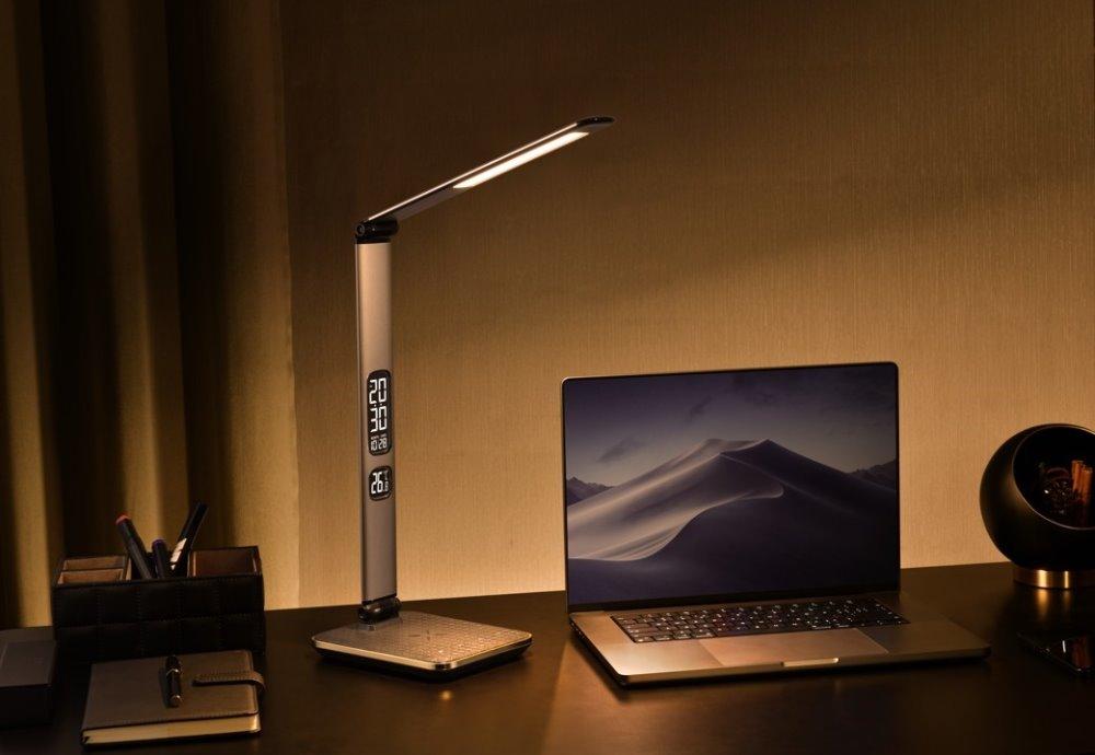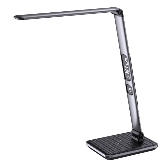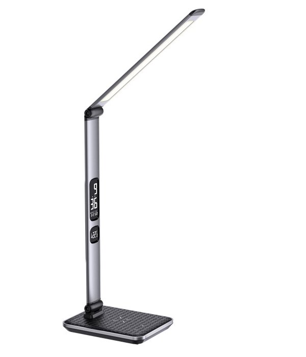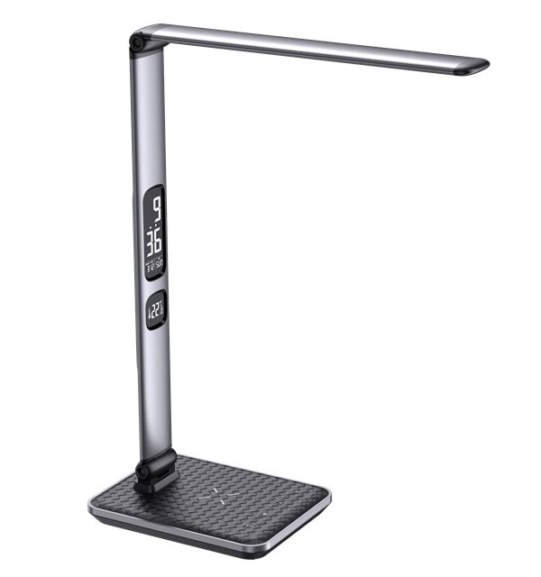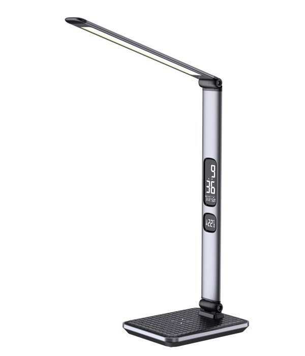 LED stolní lampička v moderním designu se sklápěcím ramenem a informačním panelem, který zobrazuje údaje o aktuálním času, datu a teplotě. Díky možnému nastavení intenzity osvětlení a teplotě barvy světla bude působit stylovým dojmem jak v kanceláři, tak v dětském pokoji. Lampička je vybavena bezdrátovou nabíječkou standardu Qi a nabíjecím USB portem pro nabíjení smartphonů a dalších zařízení.