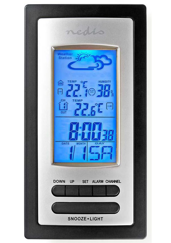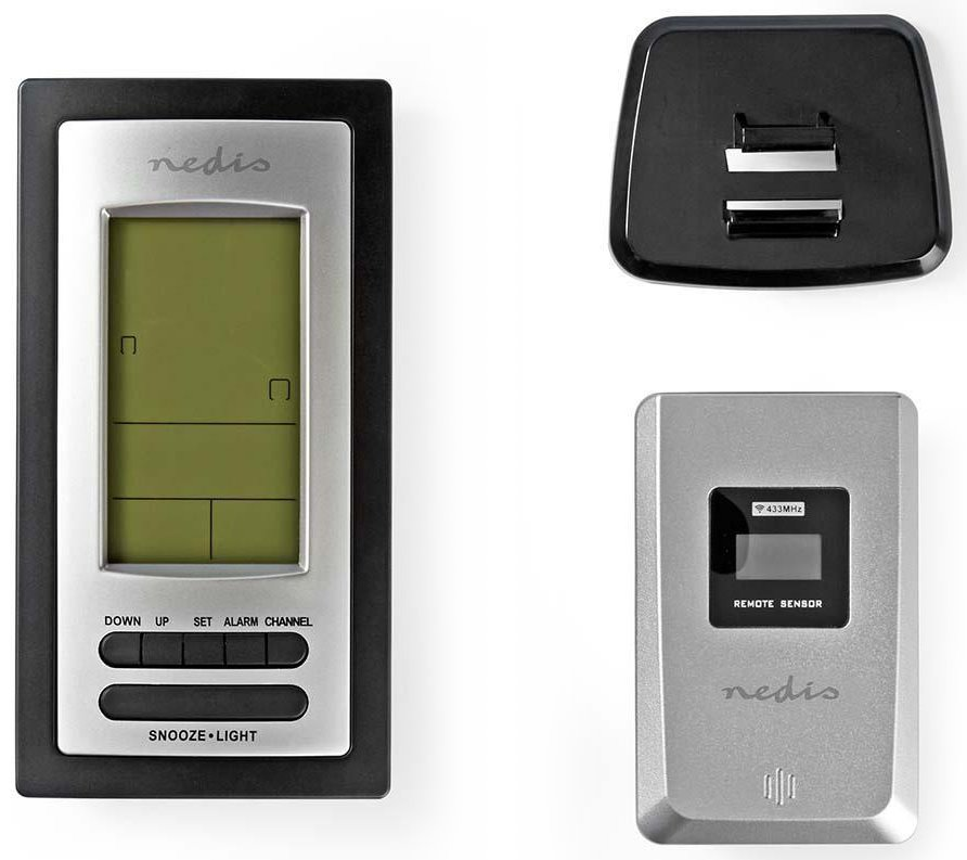 Set složený ze základny a bezdrátového čidla nabízí digitální měření vnitřní i venkovní teploty a vlhkosti vzduchu. Samozřejmostí je předpověď počasí, zobrazení datumu a času, budík či indikátor komfortu, který ukazuje stav ovzduší v místnosti. Disponuje také tlačítkem pro modré podsvícení displeje a zapnutí funkce dřímání (Snooze), když zazvoní budík. Zajisté potěší paměť pro maximální a minimální naměřené hodnoty či možnost zvukového upozornění v případě dosažení zvolené venkovní teploty. Díky odnímatelnému stojánku ji lze jak postavit na rovnou plochu, tak zavěsit na stěnu. Venkovní čidlo je také vybaveno displejem, který zobrazuje aktuální teplotu a vybraný kanál.