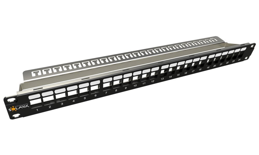 Univerzální neosazený patch panel velikosti 1U určený pro 24 keystonů (Cat5e/6/6a) Solarix.
