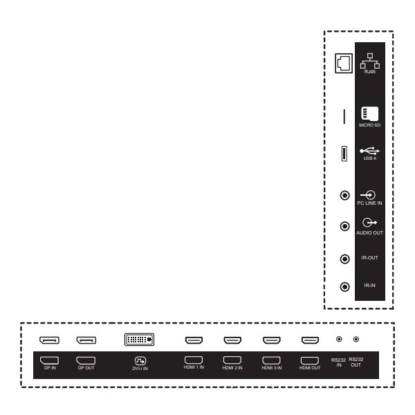Rozhraní: 3x HDMI vstup, 1x HDMI výstup, 1x DisplayPort vstup, 1x DisplayPort výstup, 1x DVI-I, 1x RJ-45, 1x USB 2.0, 1x audio vstup, 1x audio výstup, 1x RS-232 vstup, 1x RS-232 výstup, 1x IR vstup, 1x IR výstup, 1x micro SD slot
