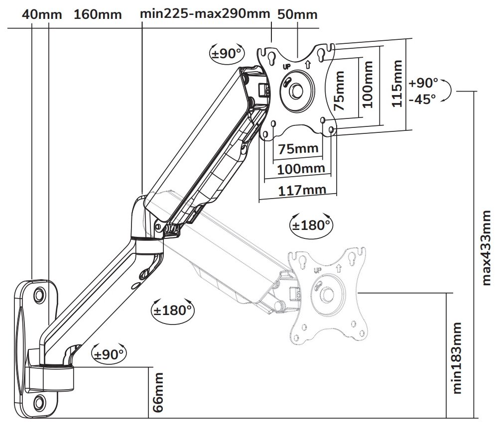 Nástěnný VESA držák je vhodný pro ploché LCD monitory o velikosti 17" až 32" a hmotnosti do 9 kg. Disponuje plynovým pístem pro vyrovnání zátěže a umožňuje snadné nastavení optimální výšky, náklonu, horizontálního otočení i změnu orientace na výšku (Pivot 360°). Intuitivní systém správy kabeláže minimalizuje nepořádek.