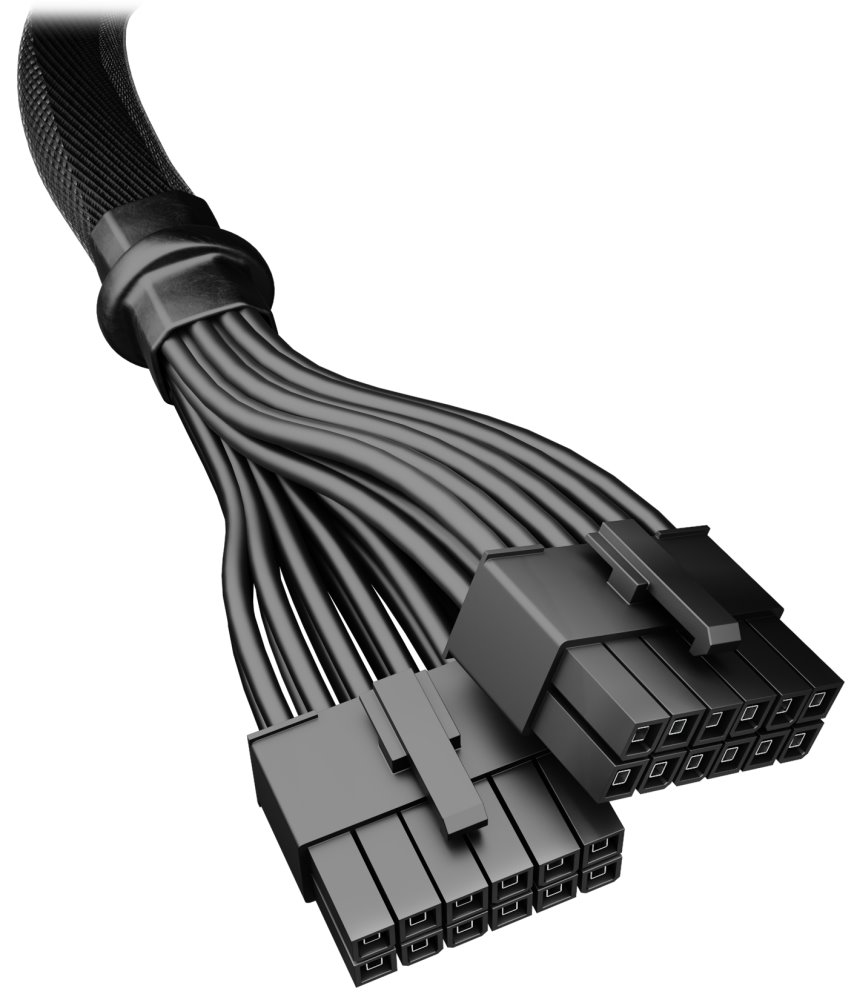 Tato redukce přináší možnost napájet nejnovější grafické karty NVIDIA řady RTX 4000 s konektorem PCIe 5.0 12+4pin (12VHPWR) pomocí dvou PCIe 12pin konektorů na kompatibilních zdrojích Be quiet!.