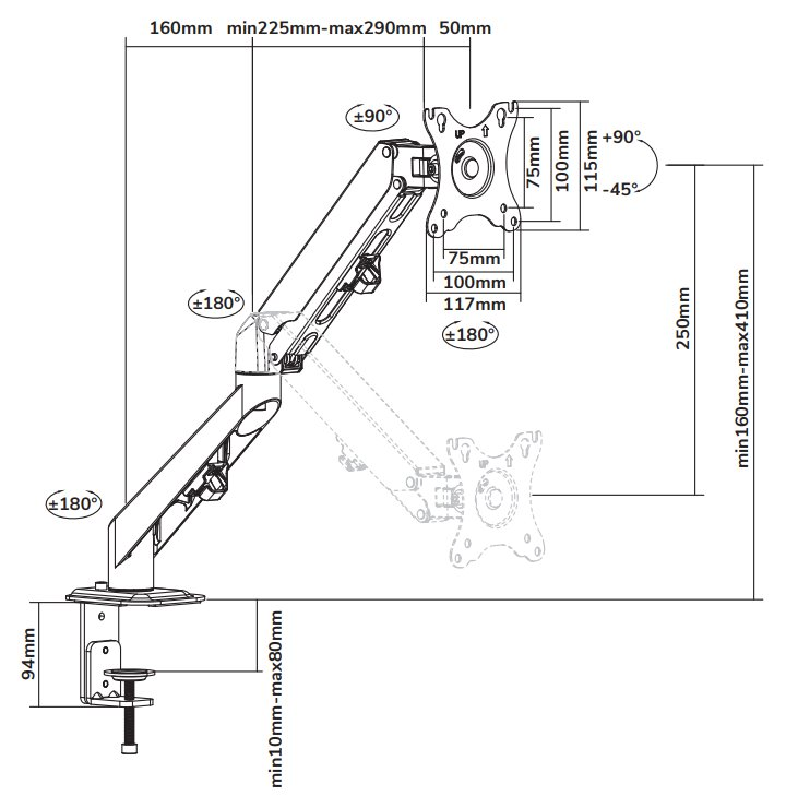 Flexibilní stolní VESA držák pro ploché LCD monitory o velikosti 17" až 27" a hmotnosti do 7 kg. Univerzální technologie naklápění, otáčení a natáčení umožňuje optimální nastavení.