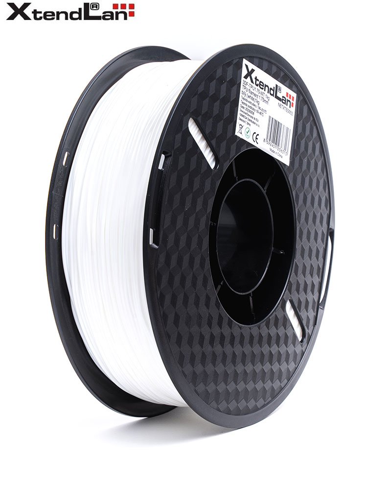Plastové vlákno (filament) pro 3D tisk, v návinu na cívce. TPU (Termoplastický polyuretan) je flexibilní materiál, který kombinuje až působivou pevnost s pružností. Vyznačuje se odolností vůči chemickým látkám, zdeformování a opotřebení. Jeho další výhodou je nižší smrštivost a při nízkých teplotách si lépe zachovává pružné vlastnosti. Vytištěný předmět lze ručně brousit a lakovat.