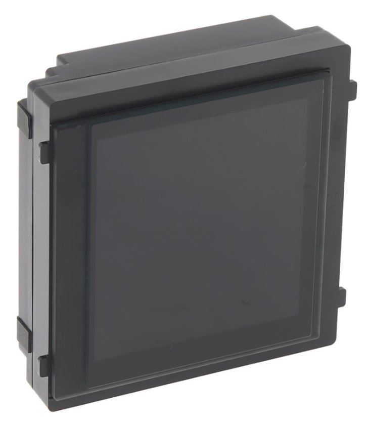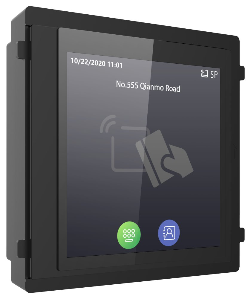 Dotykový modul 3 v 1 pro modulární dveřní stanice. Disponuje 4" displejem, čtečkou Mifare karet (13,56 MHz) a kódovou klávesnicí pro volbu účastníků nebo otevření zámku.