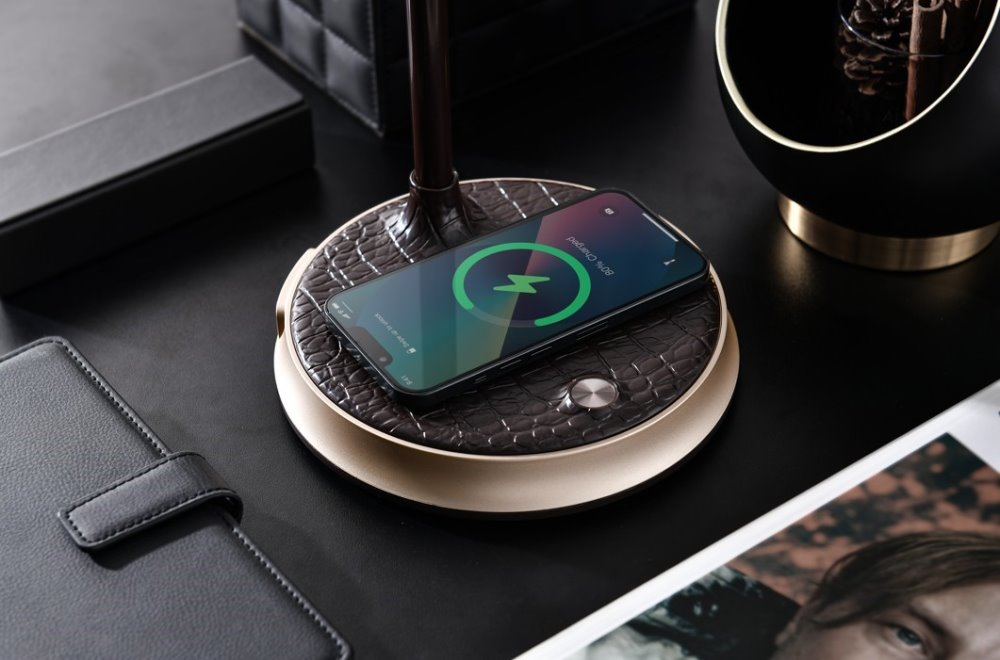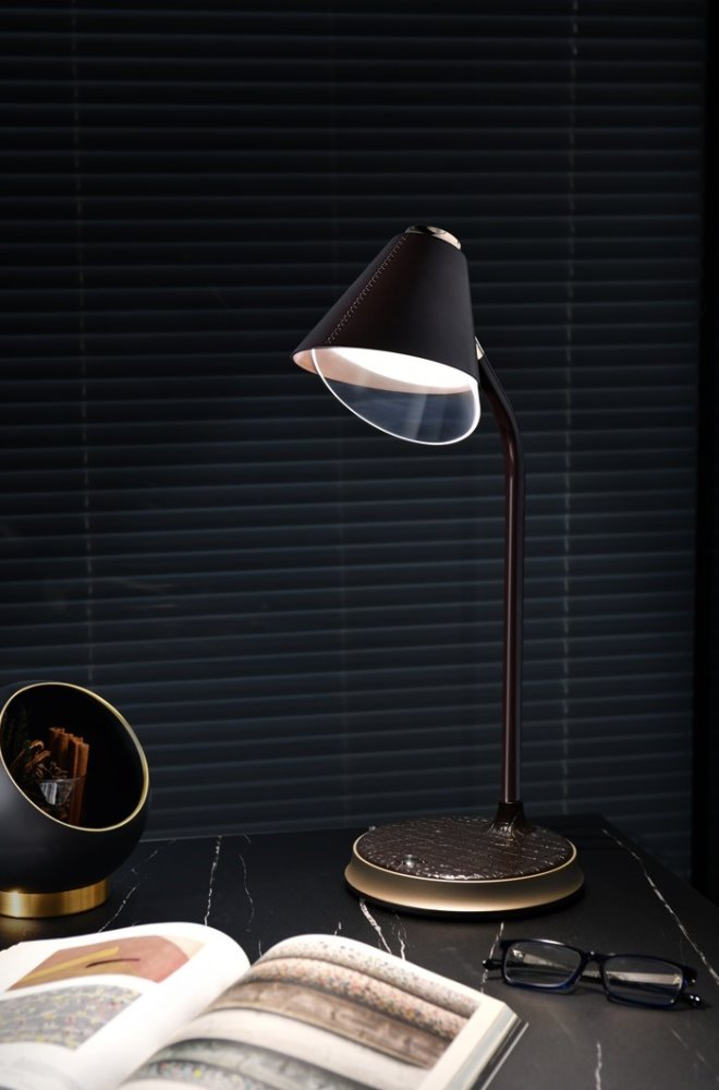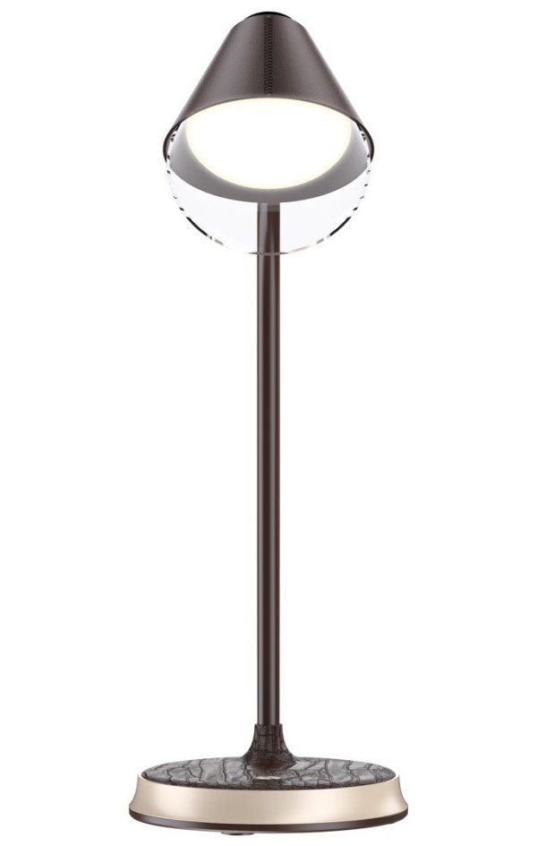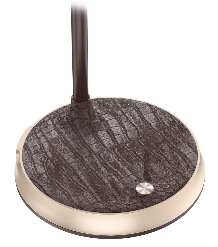 Praktická stolní lampička s pokročilou LED technologií, naklápěcí hlavou a nadčasovým designem. Hnědá imitace kůže v kombinaci se zlatými prvky z ní dělá také stylový vizuální doplněk, vhodný například do reprezentativních kancelářských prostor. Nastavení intenzity osvětlení i barevné teploty probíhá pomocí jediného dotykového tlačítka. Lampička je vybavena také bezdrátovou nabíječkou standardu Qi nabízející výkon 10 W. Mobilní telefon s podporou bezdrátového nabíjení se začne nabíjet při pouhém položení na nabíjecí plochu.