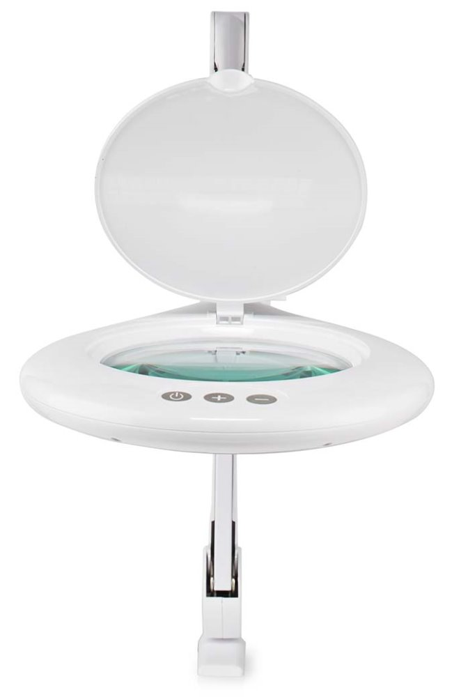 Stmívatelná LED lampička s lupou vhodná pro detailní práci s malými díly. Disponuje skleněnou čočkou o průměru 120 mm s 1,75násobným zvětšením (3 dioptrie). Lampu lze upevnit svorkou na desku stolu o tloušťce až 6 centimetrů. Flexibilní rameno o délce 125 cm, nabízející vodorovné otáčení v úhlu 260° a svislé otáčení v úhlu 210°, umožňuje perfektní nastavení osvětlení při práci. Ochranná krytka chrání čočku před nečistotami. Ovládání lampičky je velmi snadné díky dotykovým tlačítkům.