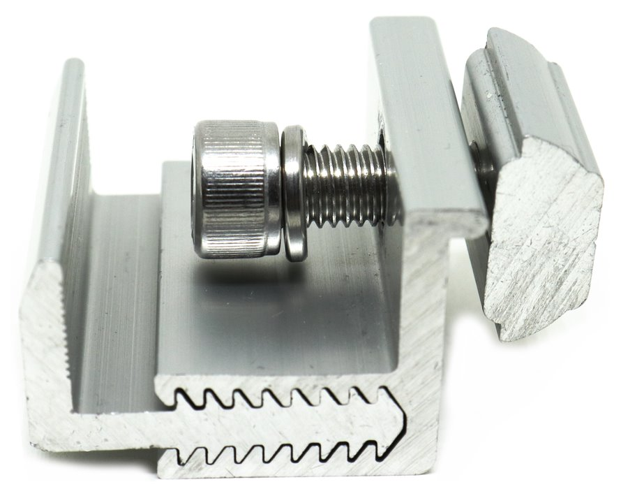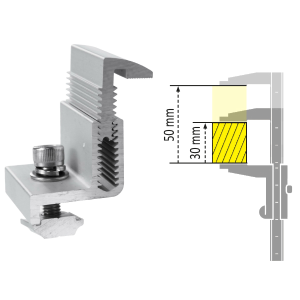 Hliníkový nastavitelný koncový držák pro solární panely určený pro montáž na nosný profil (dříve označený jako SCKD-FLEX). Je vhodný pro snadné upevnění prvního a posledního solárního panelu na hliníkovou lištu. Vždy použijte na každou stranu panelu 2 držáky. Výhodou tohoto držáku je výškové nastavení od 30 do 50 mm, což umožňuje montáž panelů všech tlouštěk.