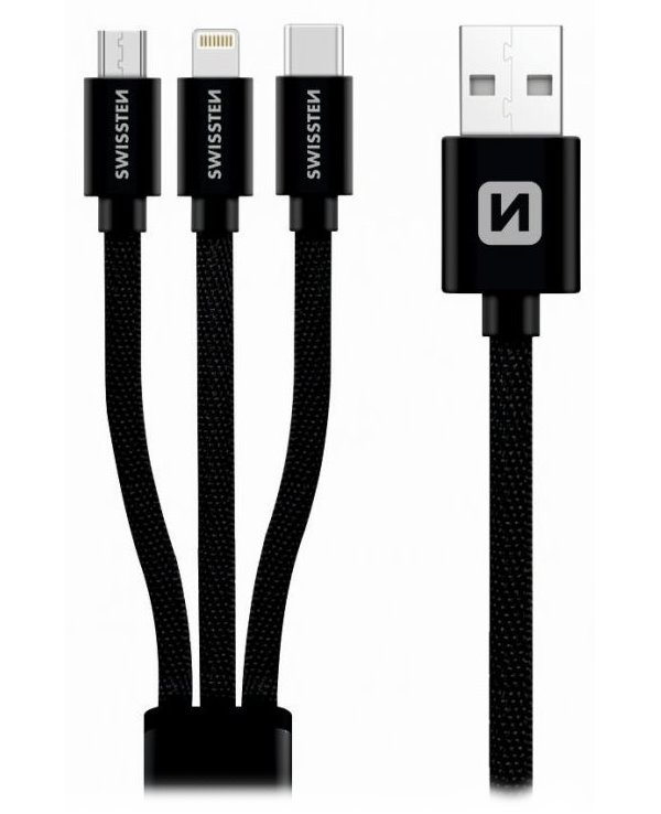 Univerzální nabíjecí a datový kabel 3 v 1 o délce 1,2 m obsahuje konektory micro USB, USB-C a Lightning. Díky kvalitnímu textilnímu opletení má vyšší výdrž proti opotřebení. Kryty konektorů jsou z eloxovaného hliníku. Kompatibilita s produkty Apple je zaručena certifikací MFi.