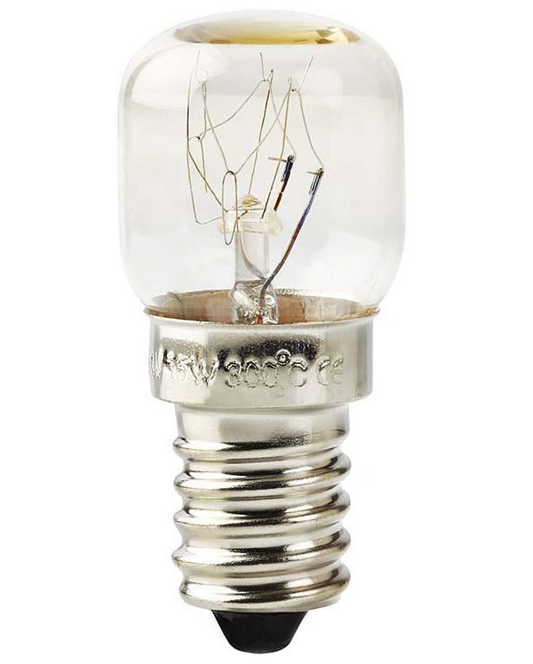 Žhavící žárovka o výkonu 15 W s paticí E14 vhodná pro použití do trouby. Je přizpůsobena pro použití při teplotě až 300 °C.