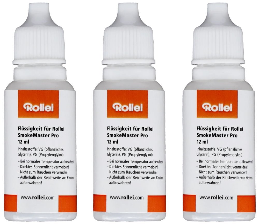 Náhradní sada tří lahviček kapaliny určené pro výrobník mlhy Rollei SmokeMaster Pro. Kapalina se skládá z rostlinného glycerinu (VG) a propylenglykolu (PG), které jsou neškodné pro člověka i životní prostředí.