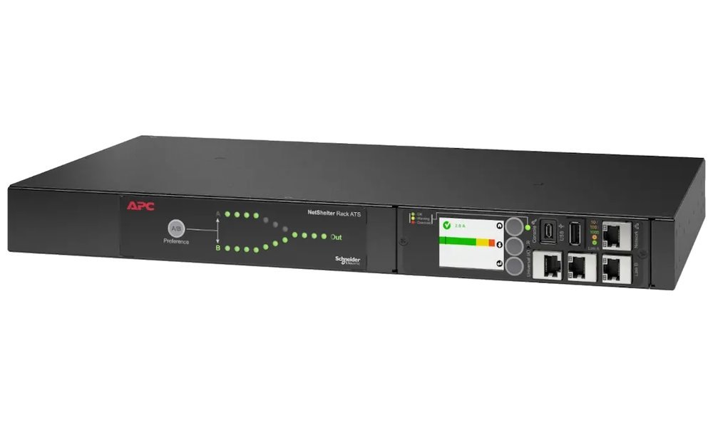Přepínač poskytující redundantní napájení jednokabelových zařízení v IT rozvaděči. AP4421A je jednofázový 1U Rack ATS se jmenovitým proudem 10 A, napětím 230 V a zatížitelností 2000 VA. Dispouje dvěma vstupními zásuvkami IEC 320 C14 a 12 výstupními zásuvkami IEC 320 C13. Tento systém je modernizován pomocí APC NMC3 a různých technických vymožeností pro sdílení síťových portů, monitorování prostředí a zvýšení bezpečnosti. Uživatelé mohou přistupovat a konfigurovat Rack ATS prostřednictvím zabezpečeného webového rozhraní, SNMP a CLI. Plně kompatibilní s EcoStruxure IT.