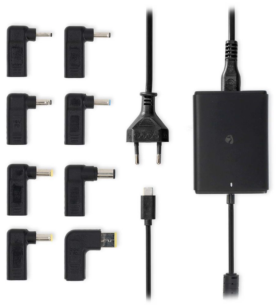 Univerzální napájecí adaptér s výstupním napětím 5–20 V disponuje portem USB-C, díky čemuž je vhodný nejen pro nabíjení notebooků, ale také chytrých telefonů a tabletů. Součástí balení je 8 výměnných napájecích konektorů, které lze nasadit na USB-C konektor. To umožňuje použití s mnoha dalšími přístroji. Nabíječka komunikuje s notebookem a vybírá nejefektivnější nabíjecí profil. Díky technologii GaN je účinnější, menší, lehčí a méně energeticky náročný než tradiční napájecí adaptéry.
