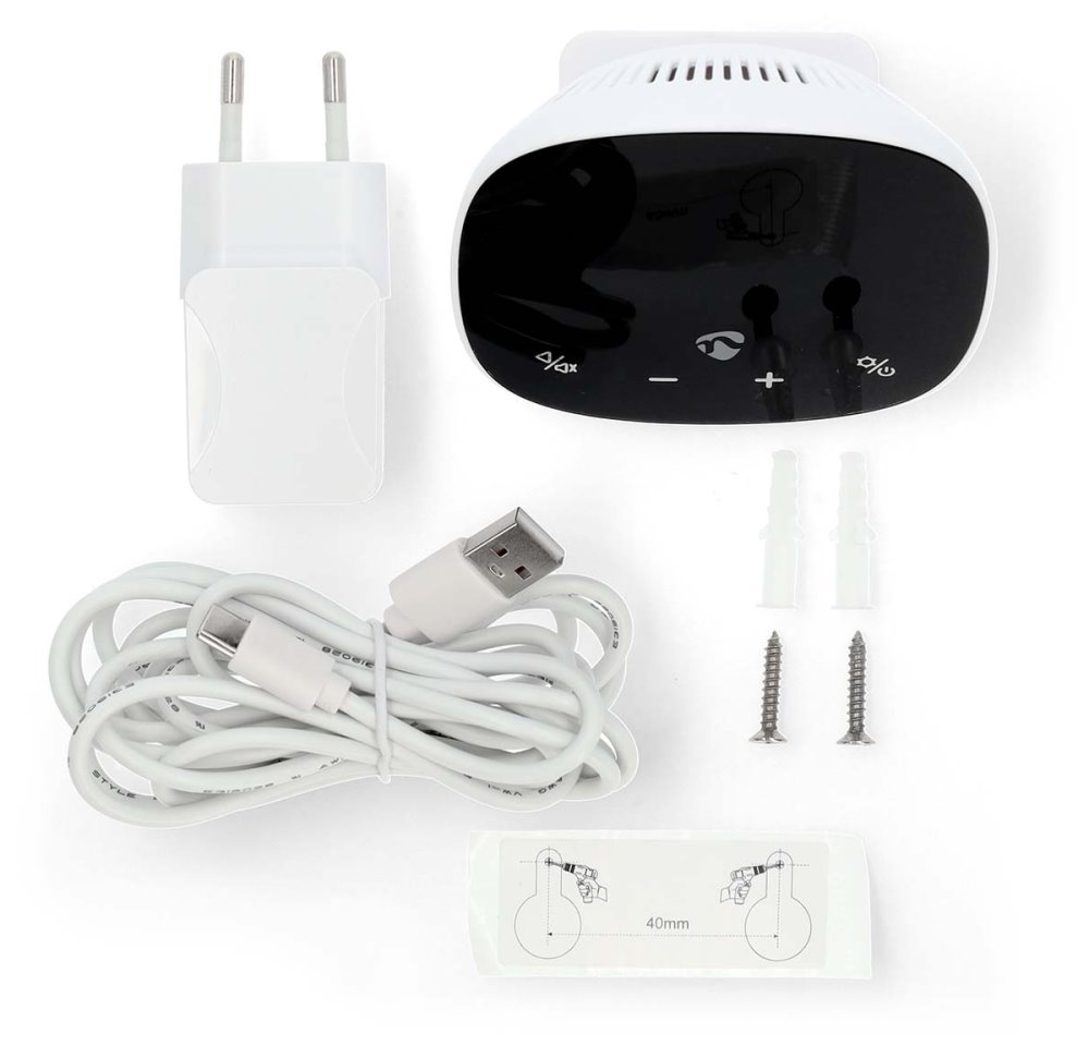 Součástí balení je držák na stěnu, USB kabel a napájecí adaptér.