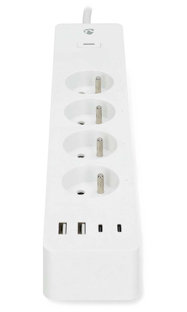 Kompaktní chytrý prodlužovací přívod s bezdrátovým připojením Wi-Fi disponuje čtyřmi zásuvkami CEE 7/5 (typ E), dvěma porty USB a dvěma porty USB-C s podporou PD 3.0 20 W.