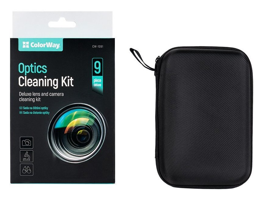 Čisticí sada ColorWay Optics. Tato 9dílná luxusní sada na čištění objektivů a fotoaparátů obsahuje vše potřebné pro správnou údržbu a péči o váš optický mikroskop, digitální fotoaparát, objektivy a další příslušenství.