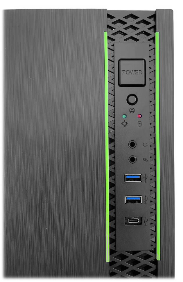 Konektory na předním panelu: 2× USB 3.0, 1× USB-C, 1× sluchátkový výstup, 1× vstup pro mikrofon