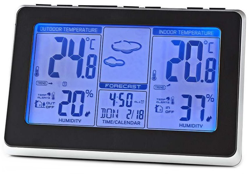 Set složený ze základny a bezdrátového čidla nabízí měření venkovní i vnitřní teploty a vlhkosti vzduchu. Samozřejmostí je zobrazení předpovědi počasí, data, dne v týdnu a času. K dispozici je také budík či indikátor komfortu, který ukazuje stav ovzduší v místnosti. Displej disponuje stylovým modrým podsvícením, které se aktivuje stiskem tlačítka.