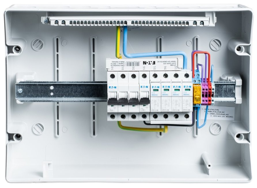 V rozvaděči je osazen svodič přepětí AC T1+T2, jistič B25/3 pro jištění vstupu do střídače a jistič B2/1, který jistí PATICI/RELE Finder, které zajišťuje N0% pro splnění podmínek distribucí (součástí je jak NC, tak NO kontakt a střed). Tím je zajištěno použití pro všechny typy měničů na trhu.
