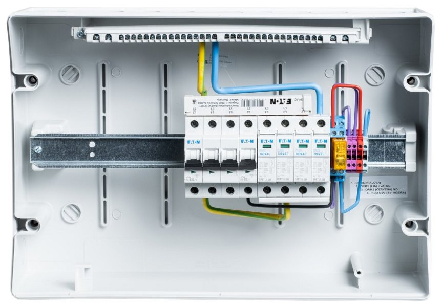 V rozvaděči je osazen svodič přepětí AC T1+T2, jistič B32/3 pro jištění vstupu do střídače a jistič B2/1, který jistí PATICI/RELE Finder, které zajišťuje N0% pro splnění podmínek distribucí (součástí je jak NC, tak NO kontakt a střed). Tím je zajištěno použití pro všechny typy měničů na trhu.