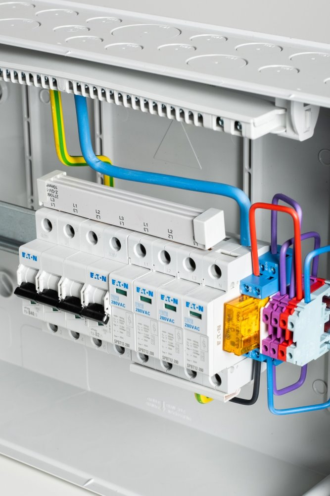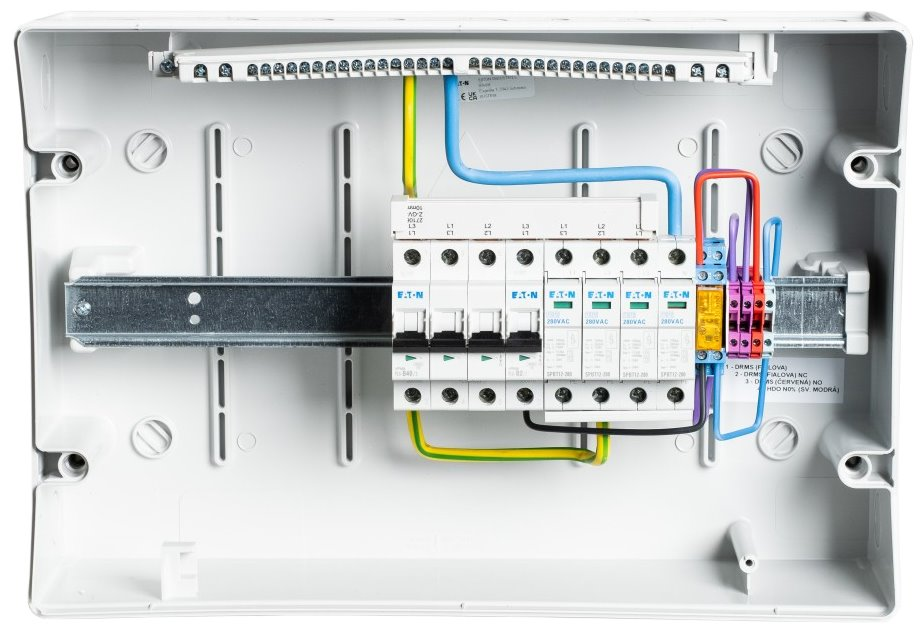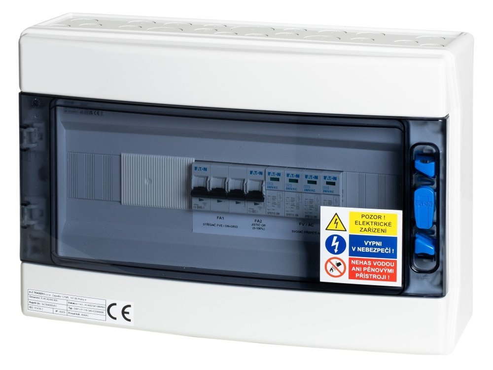 V rozvaděči je osazen svodič přepětí AC T1+T2, jistič B40/3 pro jištění vstupu do střídače a jistič B2/1, který jistí PATICI/RELE Finder, které zajišťuje N0% pro splnění podmínek distribucí (součástí je jak NC, tak NO kontakt a střed). Tím je zajištěno použití pro všechny typy měničů na trhu.