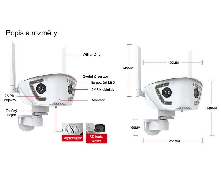 2× 2megapixelová panoramatická IP kamera typu bullet nabízí dva snímače 1/2.8" CMOS s progresivním skenem a celkovým rozlišením 3840 × 1080 obrazových bodů a složeným úhlem záběru 180°. V případě zhoršených světelných podmínek či tmy je přítomen IR přísvit do vzdálenosti až 50 m a bílý LED přísvit do vzdálenosti až 30 m. Připojení lze jednoduše realizovat bezdrátově pomocí Wi-Fi nebo drátově skrze RJ-45 port. Díky aplikaci CamHipro lze sledovat dění v domácnosti či jiných prostorech 24 hodin denně, 7 dní v týdnu odkudkoli skrze váš smartphone. Pohybové čidlo s umělou inteligencí dokáže rozpoznat rozdíl mezi člověkem, zvířetem a vozidlem. Už žádné falešné poplachy. Při aktivaci čidla dostanete okamžitou zprávu na váš mobilní telefon. Kamera navíc disponuje zabudovaným mikrofonem a reproduktorem. Záznamy se ukládají lokálně na micro SD kartu s maximální kapacitou až 128 GB (není součástí balení) nebo na Cloud. Napájena je pomocí přiloženého AC adaptéru. Díky voděodolnosti dle IP66 nabízí jak vnitřní, tak i venkovní možnost použití.