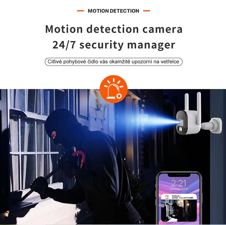 Chytrá venkovní bezpečnostní kamera s PIR čidlem pro detekci pohybu zajistí dokonalé zabezpečení prostoru. Snímač nabízí rozlišení 5 Mpx a je schopný snímat video v rozlišení 2880 × 1616 při 25 fps. Pro případ zhoršených světelných podmínek je přítomen IR a bílý LED přísvit pro pořizování barevných záznamů v noci. Součástí kamery je integrovaný reproduktor a mikrofon, který umožní kvalitní oboustrannou komunikaci. Natočené záznamy je možné ukládat i na microSD kartu o kapacitě až 128 GB nebo na cloud. Připojení lze jednoduše realizovat bezdrátově pomocí Wi-Fi. Praktická technologie detekce pohybu osob spolu s vestavěnou sirénou spolehlivě ochrání vaši domácnost a odradí nežádoucí návštěvy. Poplach se může aktivovat také při detekci zvuku, což zvyšuje úroveň ochrany. O narušení prostoru se ihned dozvíte skrze notifikaci, kterou kamera zašle do vašeho mobilního telefonu prostřednictvím aplikace Tuya. Nabíjení je realizováno prostřednictvím USB-C portu. Potěší kompatibilita s Amazon Alexa, Google Assistant a ONVIF.