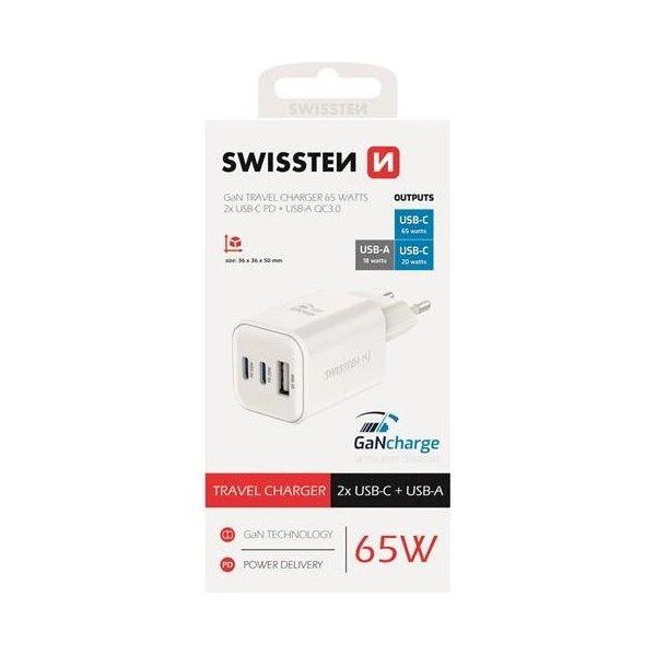 Síťový adaptér SWISSTEN GaN pro rychlé nabíjení rozmanitých zařízení. Tento model disponuje rozličnými porty a díky vysokému výkonu až 65 W je ideální pro napájení nejenom drobné nositelné elektroniky, smartphonů či tabletů, ale také některých notebooků. Adaptér je natolik kompaktní, že jej snadno vezmete všude s sebou. Mezi další přednosti patří přítomnost dvou konektorů USB-C a jednoho konektoru USB, takže v domácnosti nebo kanceláři můžete nabíjet více zařízení najednou.