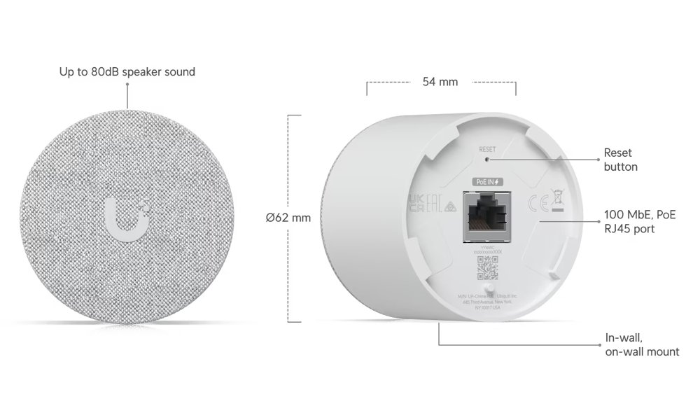 Plug-and-play reproduktor o výkonu 80 dB určený ke spárování se zvonkem UniFi nebo rozbočovačem přístupu ke dveřím. Nabízí možnost zápustné montáže do zdi i montáže na zeď. Připojení a napájení je realizováno pomocí PoE.