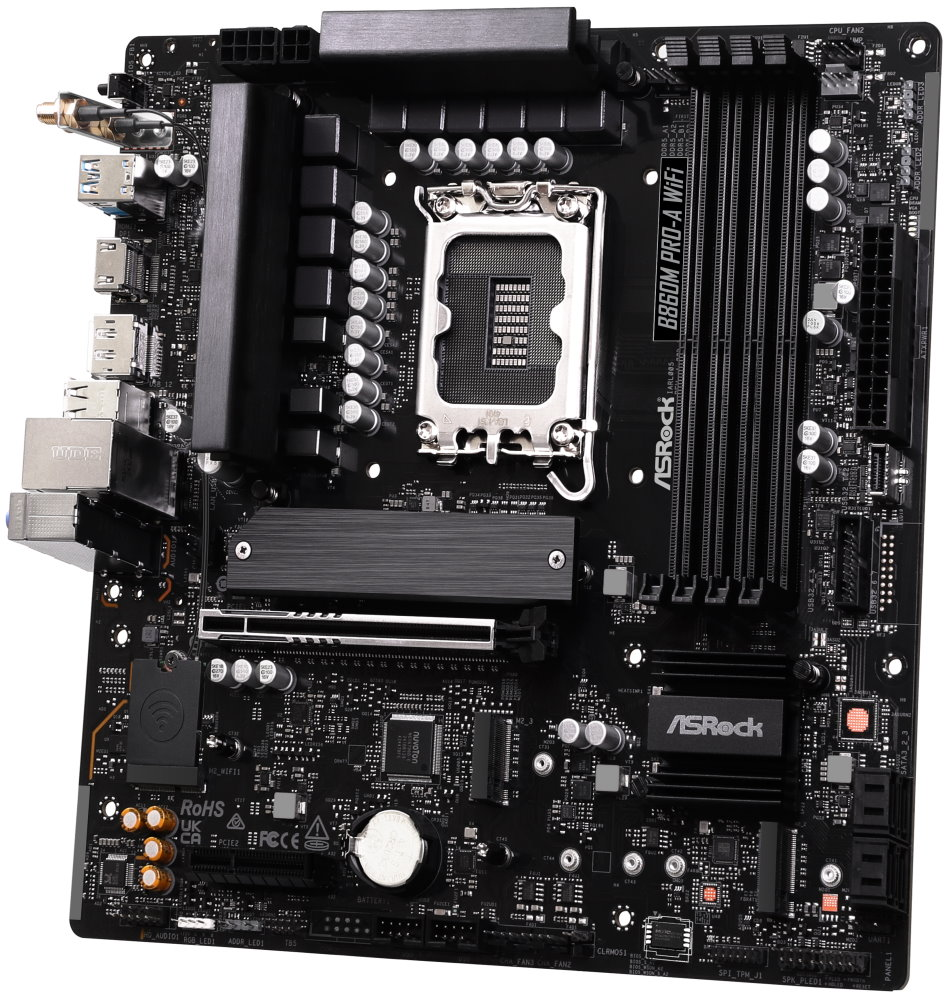 Základní deska ASRock B860M Pro-A WiFi je dále osazena rozhraním PCIe Gen5 Blazing M.2, které nabízí dvojnásobnou šířku pásma a je ideální pro vysokorychlostní SSD. Během vysoké provozní zátěže – například při práci s náročnými aplikacemi nebo hraní her – zajistí spolehlivý chod zajistí hliníkový chladič spolu s headery ventilátorů a funkce pro vyladění výkonu.