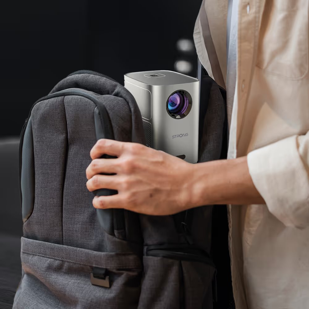Miniaturní projektor Strong Q1 poskytuje ostrý a detailní obraz v lehkém a přenosném provedení. Je vhodný pro promítání filmů, videí, případně prezentace kdekoli na cestách. Díky technologii rozptýleného odrazu produkuje rovnoměrné světlo, které zbytečně nezatěžuje oči a sledování obsahu je mnohem příjemnější. Projektor dosahuje extrémně nízké váhy 0,8 kg a můžete s ním vyrazit kamkoli.