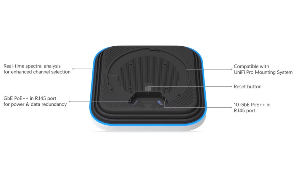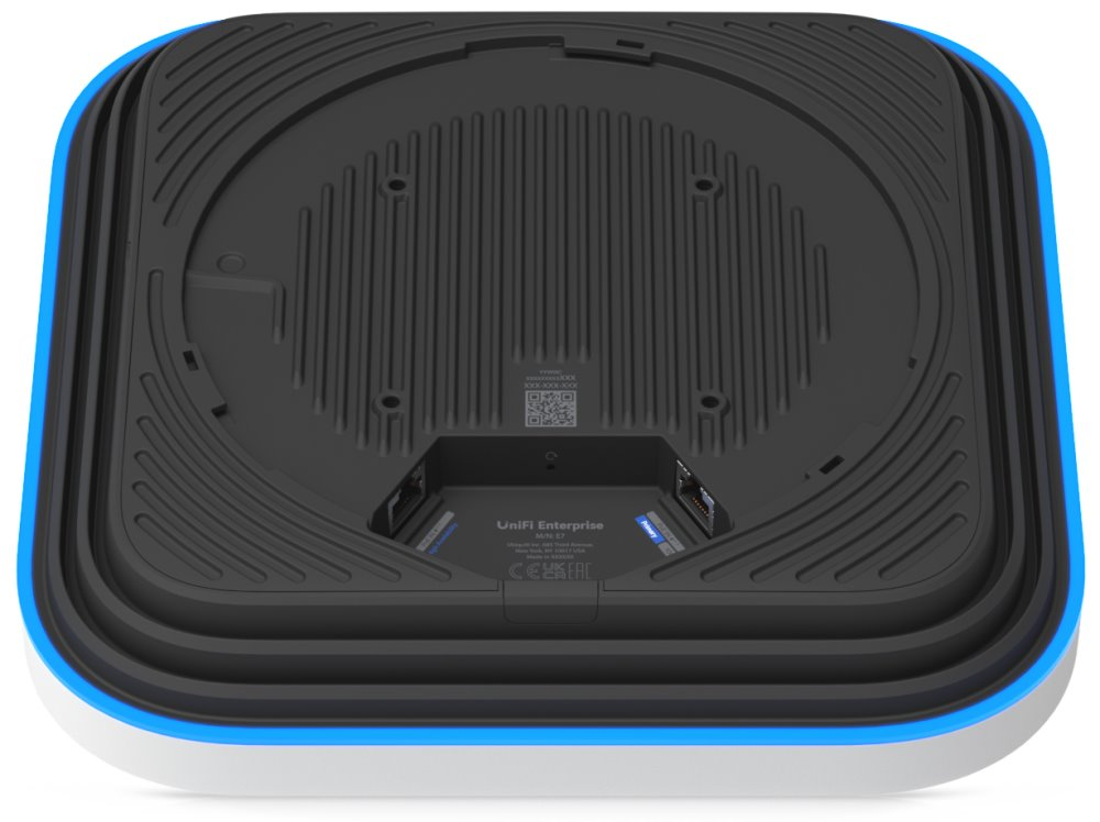 UniFi E7 je designově povedené vnitřní hotspotové řešení využívající standard 802.11be (Wi-Fi 7) a je vybaveno anténním systémem DL/UL MU-MIMO 4×4 s šířkou kanálu až 320 MHz pro vysokokapacitní připojení (uplink/downlink). AP vyniká větším ziskem antén 5 dBi (2,4 GHz), 6 dBi (5 GHz) a 6 dBi (6 GHz), díky tomu zkvalitňuje oboustrannou komunikaci mezi vzdálenými klienty a AP. Přístupový bod podporuje aktivní PoE++ napájení.