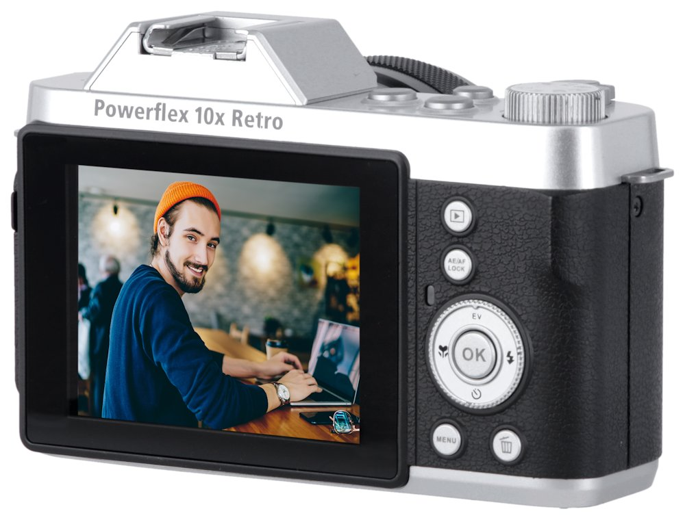 Digitální fotoaparát Rollei Powerflex 10x Retro nabízí retro design, obrazový snímač Sony IMX415 s rozlišením 8 Mpx (až 64 Mpx interpolovaně) a objektiv s 10násobným optickým zoomem. Dokáže také nahrávat 4K video v rozlišení až 2880 × 2160 při 24 fps. Je vybaven bleskem a 2,88" LCD displejem na zadní straně pro snadné ovládání. Pro ukládání záznamů ve formátech JPG a MP4 disponuje slotem na microSD kartu do kapacity až 64 GB. K dispozici je osm fotografických režimů či funkce časosběru pro dokonalé zachycení každého okamžiku. Zajisté potěší také funkce detekce obličeje. Nabíjení a přenos dat lze realizovat pomocí USB-C konektoru, nechybí ale ani port HDMI a vstup pro mikrofon. Napájení zajišťuje vyměnitelná baterie s kapacitou 1500 mAh.