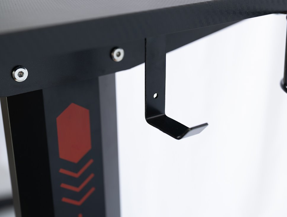 Kompaktní a stylový herní stůl s pevnou konstrukcí zaručuje stabilitu a pohodlí během dlouhých herních maratonů. I přes své menší rozměry se na něj díky pravidelnému obdélníkovému tvaru vejde vše, co potřebujete. A pokud máte rádi sestavy s více monitory, díky jeho tvaru k němu velmi snadno připevníte stojany na monitory. Díky výškově nastavitelným nožičkám se nemusíte obávat ani kymácení na nerovném povrchu. Guma na spodní straně nožiček navíc chrání podlahu před poškrábáním. Potěší také držák na nápoje, který ochrání klávesnici a myš před nechtěným politím, a háček na sluchátka.