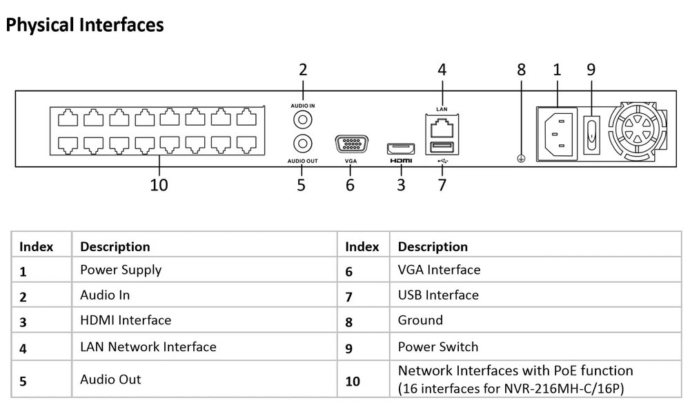 Kromě 16 PoE portů nabízí samostatný Gigabit Ethernet port pro připojení k síti. Podporuje až 32 současných vzdálených připojení a kompletní sadu síťových protokolů včetně DHCP, DDNS, RTSP a UPnP.