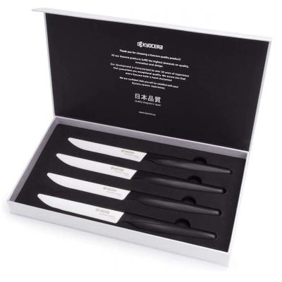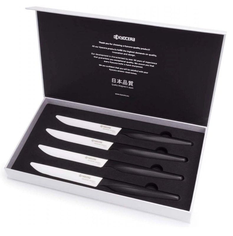 Pro milovníky masa není nic lepšího než dokonale ugrilovaný, křehký a šťavnatý steak. Aby byla zachována dokonalost a maximální požitek od přípravy až po stolování, steakové nože Kyocera s extra ostrými vroubkovanými keramickými čepelemi umožňují čisté a snadné krájení bez nutnosti vyvíjet nadměrnou sílu. Čepele jsou vyrobeny ze zirkonové keramiky – extrémně tvrdého materiálu, který udržuje ostrost. Jejich elegantní vzhled a ergonomicky tvarovaná rukojeť dodají sofistikovanost každému prostírání.