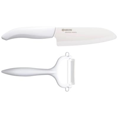 Sada na krájení a loupání značky Kyocera se skládá z keramického nože Santoku a škrabky v bílé barvě. S těmito praktickými kuchyňskými pomocníky lze jídlo připravit rychle a snadno. Jsou ideální pro loupání, strouhání a krájení a jsou nepostradatelné v každé moderní kuchyni.