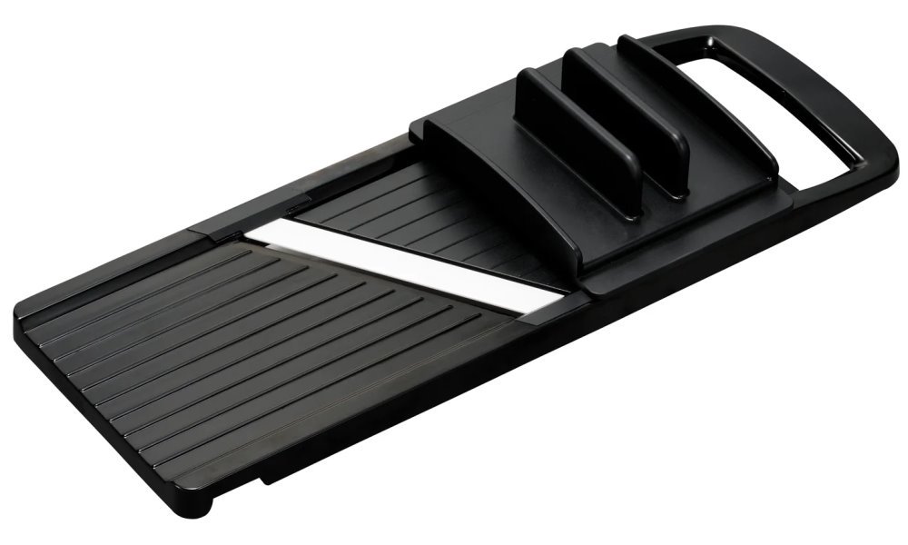 Široký nastavitelný kráječ s ochranou ruky je ideálním pomocníkem do každé kuchyně.