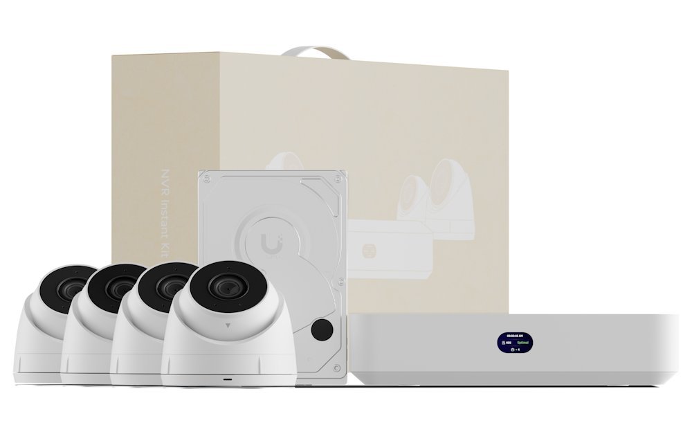 Kompaktní sada UniFi Protect NVR obsahující 1× UniFi Protect NVR Instant, 4× kameru G5 Turret Ultra a 1× HDD (1 TB). Komplexní řešení pro rychlé a snadné nasazení.